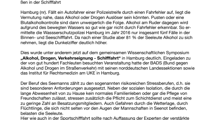 Dies wurde unter anderem jetzt auf dem gemeinsamen Wissenschaftlichen Symposium „Alkohol, Drogen, Verkehrseignung - Schifffahrt“ in Hamburg deutlich. Eingeladen zu der von gut hundert Fachleuten besuchten Veranstaltung hatte der BADS (Bund gegen Alkohol und Drogen im Straßenverkehr) mit seinen norddeutschen Landessektionen sowie das Institut für Rechtsmedizin am UKE in Hamburg.