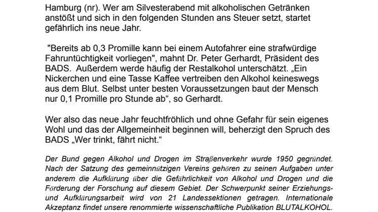 "Bereits ab 0,3 Promille kann bei einem Autofahrer eine strafwürdige Fahruntüchtigkeit vorliegen", mahnt Dr. Peter Gerhardt, Präsident des BADS. Außerdem werde häufig der Restalkohol unterschätzt. „Ein Nickerchen und eine Tasse Kaffee vertreiben den Alkohol keineswegs aus dem Blut. Selbst unter besten Voraussetzungen baut der Mensch nur 0,1 Promille pro Stunde ab“, so Gerhardt.