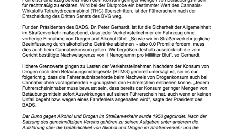 Für den Präsidenten des BADS, Dr. Peter Gerhardt, ist für die Sicherheit der Allgemeinheit im Straßenverkehr maßgebend, dass jeder Verkehrsteilnehmer ein Fahrzeug ohne vorherige Einnahme von Drogen und Alkohol führt. „So wie wir im Straßenverkehr jegliche Beeinflussung durch alkoholische Getränke ablehnen - also 0,0 Promille fordern, muss dies auch beim Cannabiskonsum gelten. Wir begrüßen deshalb ausdrücklich die vom Gericht bestätigte Nachweisgrenze von 1 Nanogramm pro Milliliter Blut“, so Gerhardt.