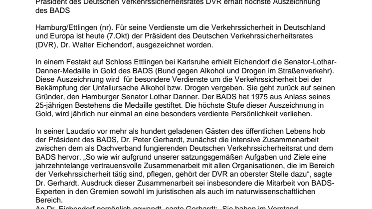 Hamburg/Ettlingen (nr). Für seine Verdienste um die Verkehrssicherheit in Deutschland und Europa ist heute (7.Okt) der Präsident des Deutschen Verkehrssicherheitsrates (DVR), Dr. Walter Eichendorf, ausgezeichnet worden.