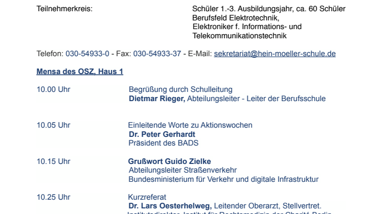 In der Hein-Moeller-Schule -OSZ Energietechnik II - Berufsschule - Allee der Kosmonauten 18 - 10315 Berlin. Bezirk Lichtenberg. Ortsteil Lichtenberg startet der Bund gegen Alkohol und Drogen im Straßenverkehr (BADS) am Montag (26. November) bundesweite Aktionswochen mit Fahrsimulatoren für junge Fahranfänger. In der Zeit bis zum 8. November werden dazu in den 21 Landessektionen Instrukteure und Moderatoren des BADS neben Kurzvorträgen insbesondere in den Simulatoren und T-Walls praxisnahe Erfahrungen zur Verkehrssicherheit vermitteln.