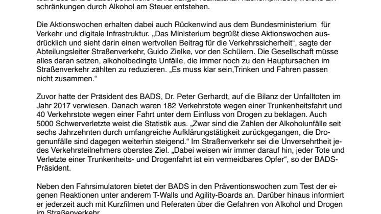 Die Aktionswochen erhalten dabei auch Rückenwind aus dem Bundesministerium für Verkehr und digitale Infrastruktur. „Das Ministerium begrüßt diese Aktionswochen ausdrücklich und sieht darin einen wertvollen Beitrag für die Verkehrssicherheit“, sagte der Abteilungsleiter Straßenverkehr, Guido Zielke, vor den Schülern. Die Gesellschaft müsse alles daran setzen, alkoholbedingte Unfälle, die immer noch zu den Hauptursachen im Straßenverkehr zählten zu reduzieren. „Es muss klar sein, Trinken und Fahren passen nicht zusammen.“
