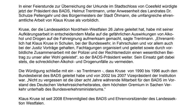 Die Würdigung schließe mit ein - so Trentmann -, dass Kruse von 1990 bis 1996 auch den Bundesbeirat des BADS geleitet habe und von 2002 bis 2007 Vizepräsident der Institution war. „Nicht zu vergessen ist die über acht Jahre währende Mitarbeit für den BADS im Vorstand des Deutschen Verkehrssicherheitsrates, dem höchsten Gremium in Sachen Verkehr unterhalb des Bundesverkehrsministeriums.“